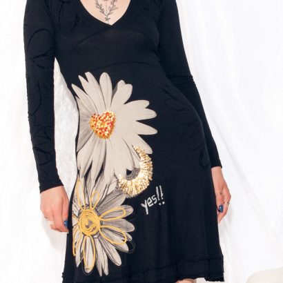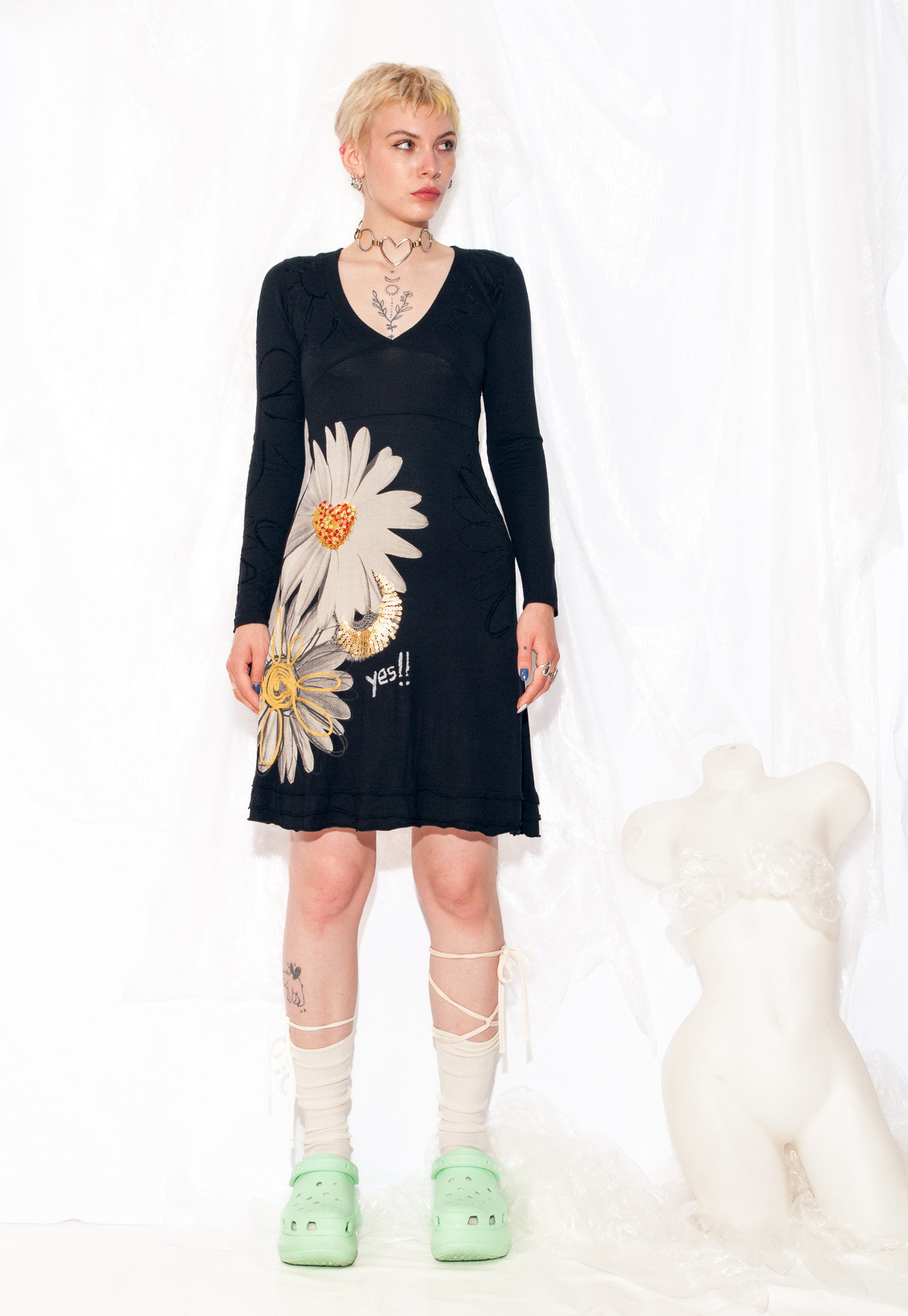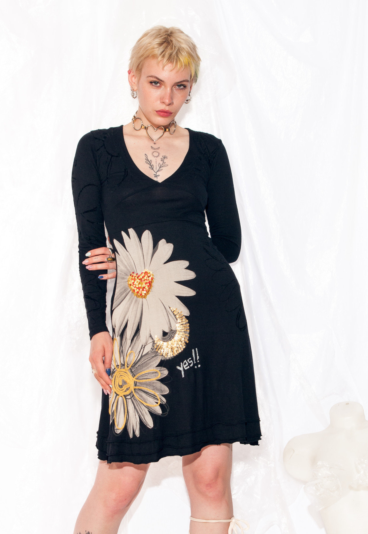This black knit dress, embellished with an oversized daisy appliqué and a shimmering heart centerpiece, will add a touch of personality to your wardrobe. The soft V-neckline creates a refined neckline, while the slim waist and flowing A-line hem flatter the figure from every angle. The stretch knit fabric provides comfort, while the lightweight side panels add texture and movement. Pair this piece with heels and a clutch, or with boots and a cropped jacket for a fresh and sweet look.