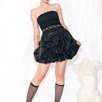 Make a stunning statement in this black off-the-shoulder mini dress. The pleated bandeau bodice is fluid and slender, while the sculptural puff skirt creates playful volume and a modern silhouette for an elegant spin. The perfect balance of minimalist top and dramatic bottom makes this dress the perfect choice for birthdays, club nights, and holiday parties.