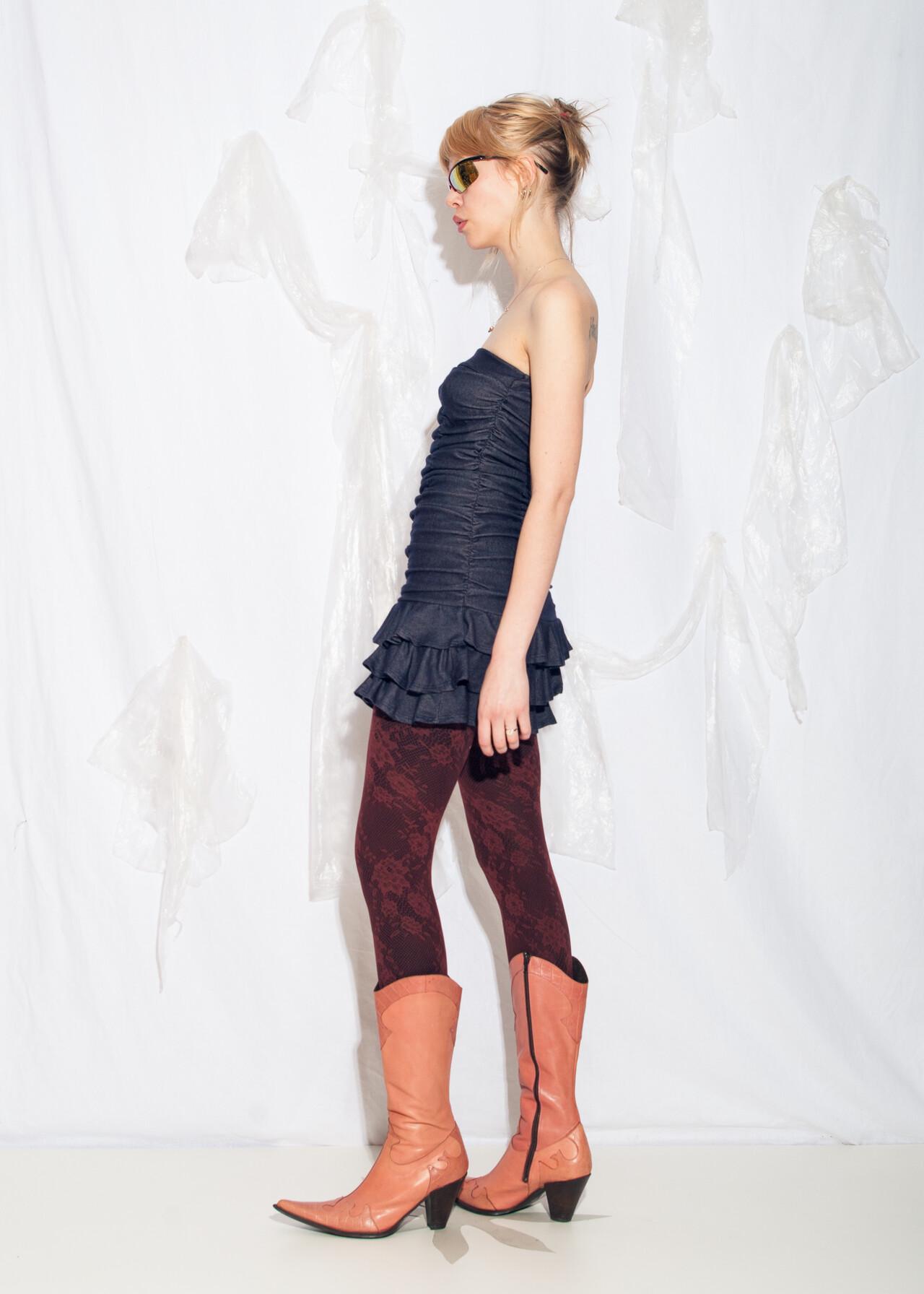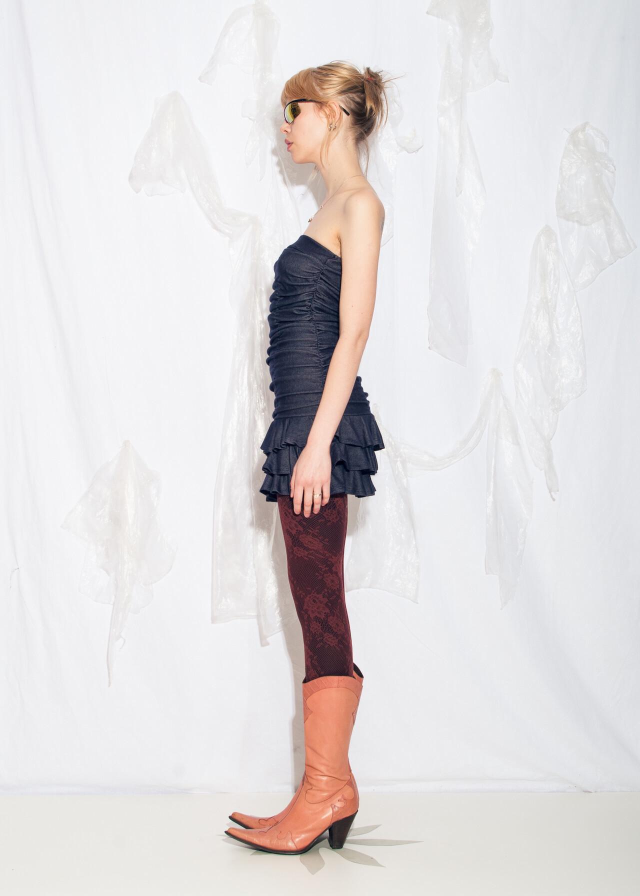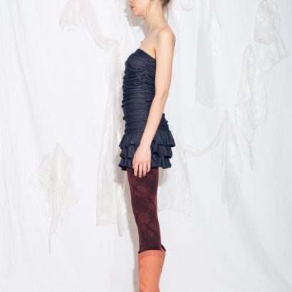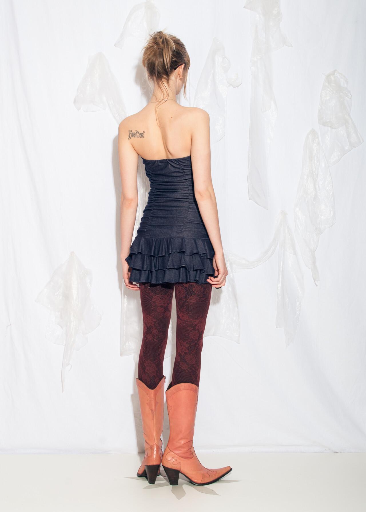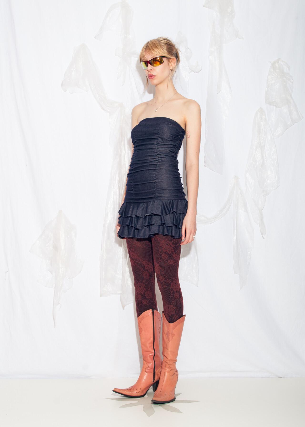 Stretch bodycon silhouette with pleats throughout and a flared, tiered hem. Choose the perfect fit for your comfort.