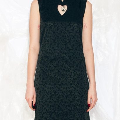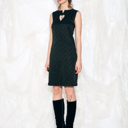 This black sleeveless sheath dress combines clean lines with playful details. The heart-shaped cutout neckline is eye-catching, while the delicate jacquard texture adds a subtle layering without overwhelming the dress. The soft stretch and knee-length cut make it easy to transition from office wear to evening with just a change of shoes.