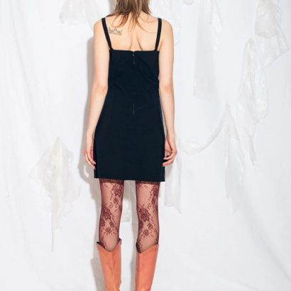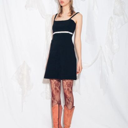 Simple and stylish, this black mini skirt features a square neckline and wide shoulder straps to define the shoulders. The contrasting white satin ribbon at the high waist adds a fresh, elegant touch. This A-line skirt fits snugly at the hips, allowing for full movement, making it a perfect choice for evenings, parties, and weekend getaways.