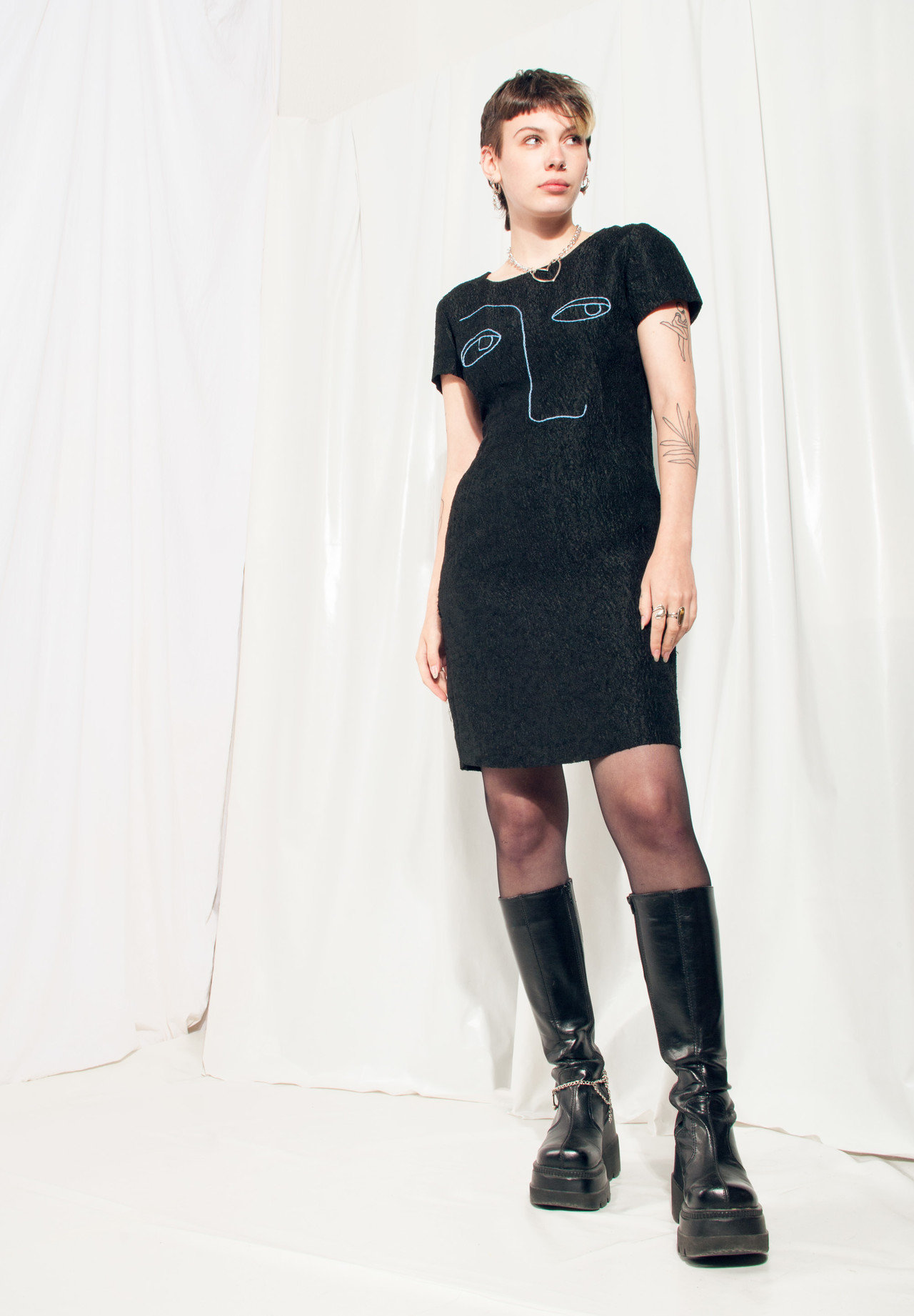 This black, short-sleeved sheath dress seamlessly blends minimalist lines with artistic flair. The flowing crew neckline and tailored silhouette create a modern silhouette, accented by blue line embroidery on the chest. The textured knit fabric offers gentle stretch, allowing for comfortable movement from meetings to evening events.