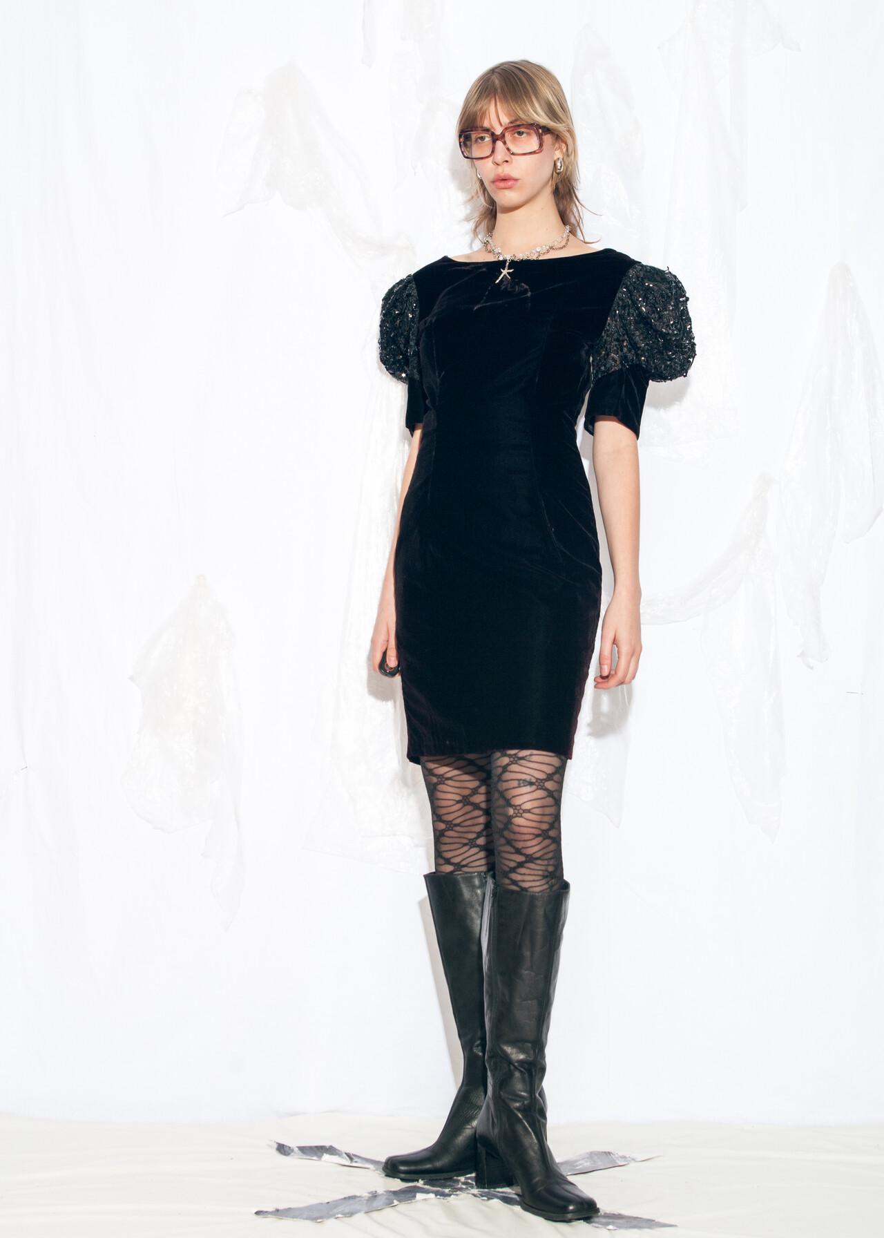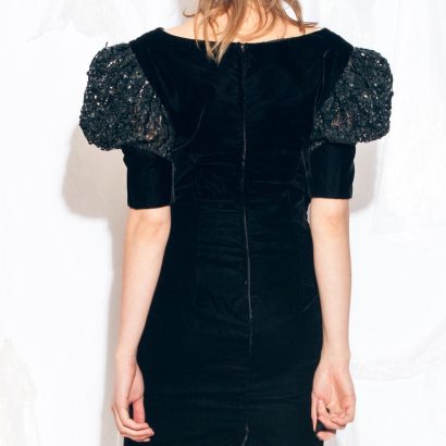 Stretch velvet skirt; sleeve embellishment (beading/sequins)