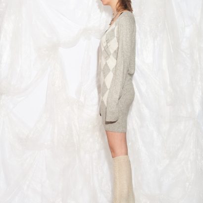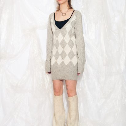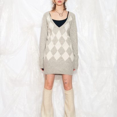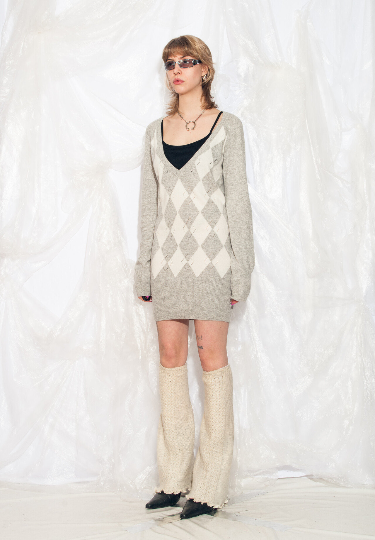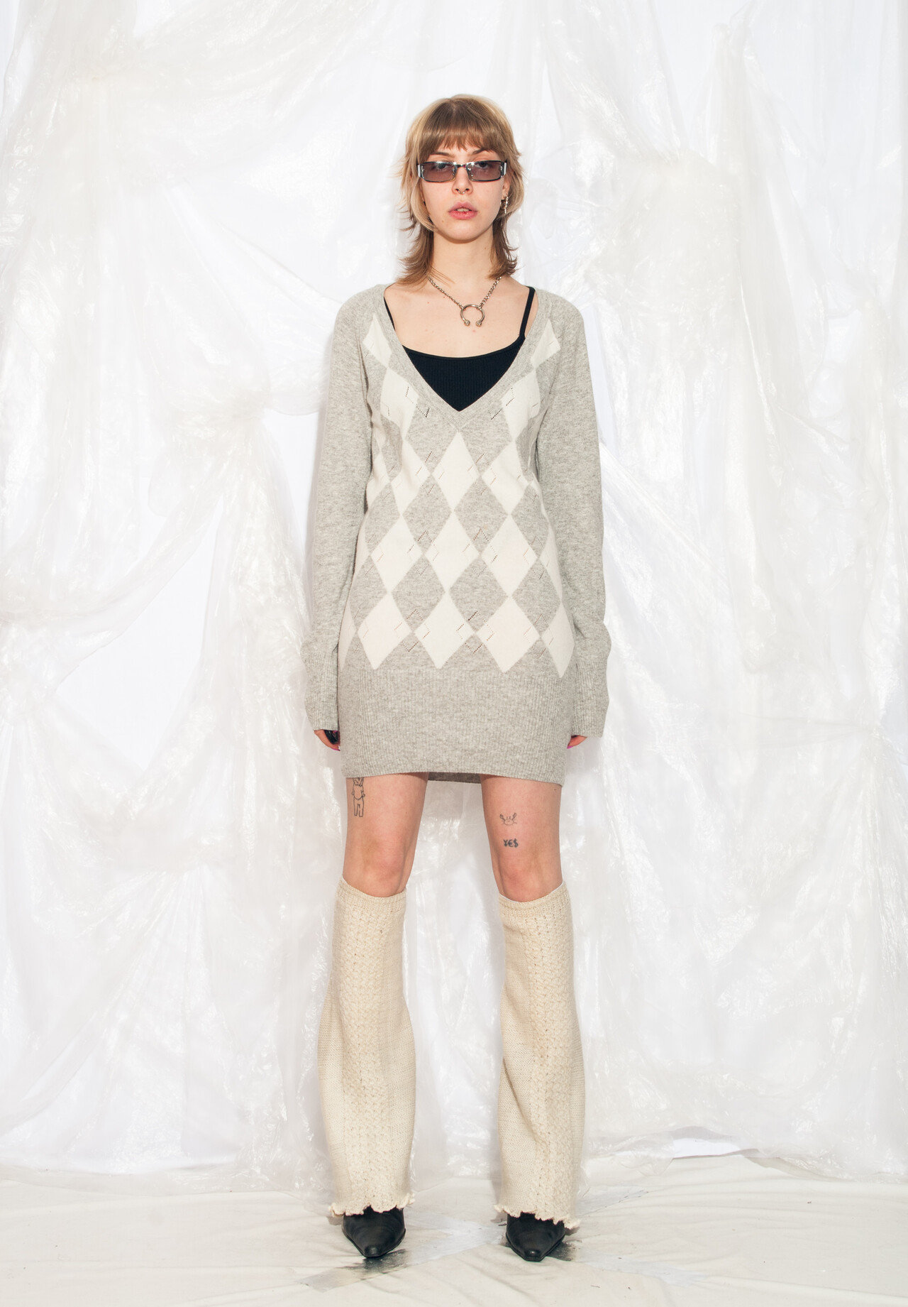 A preppy staple, effortlessly comfortable. This gray sweater dress features a deep V-neck and bold argyle panels, instantly elevating a simple look. The soft, stretch knit fabric is fitted without being constricting, and the ribbed edges create a streamlined silhouette. Wear it alone with knee-high boots for a cute weekend look, or layer it with a T-shirt and loafers for a preppy-cool vibe.